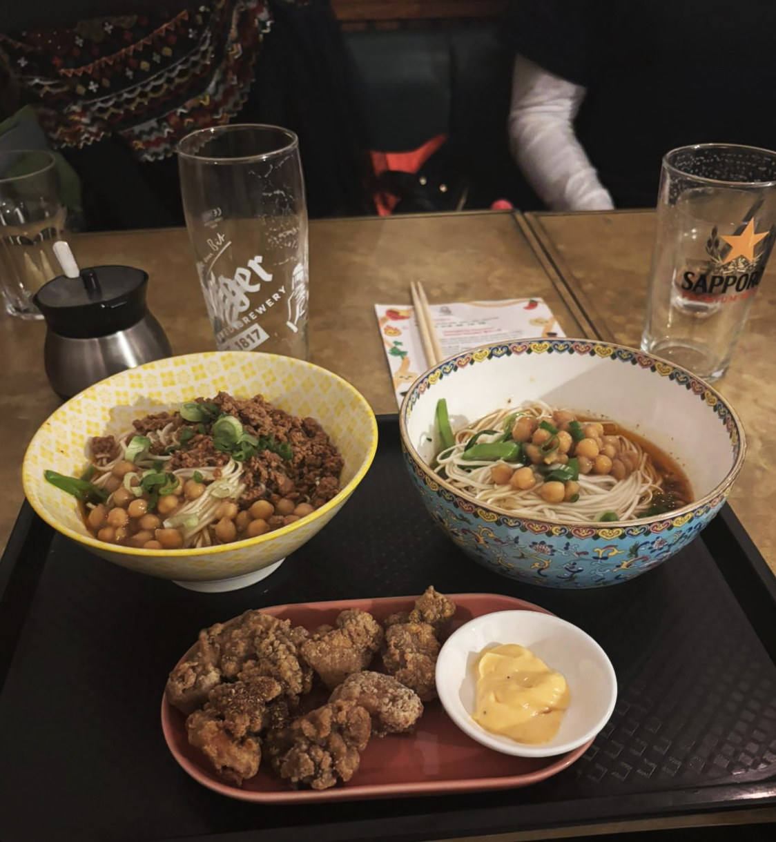 The menu is all comfort food, but not heavy or overdone. The noodles are the first thing you notice, glossy with chilli oil, properly slurpable, with just enough heat that builds as you go rather than hitting all at once. You can go for pork or beef, or mix both if you want more going on. The wontons are soft and delicate, but still punchy with that málà kick. The popcorn chicken is the delicious surprise - crisp, tender and dusted with that numbing spice that creeps up on you so you keep reaching back in without thinking. Even the green tea ice cream at the end just fits. Cold, slightly bitter, nothing fancy - just a clean way to reset your pallet.